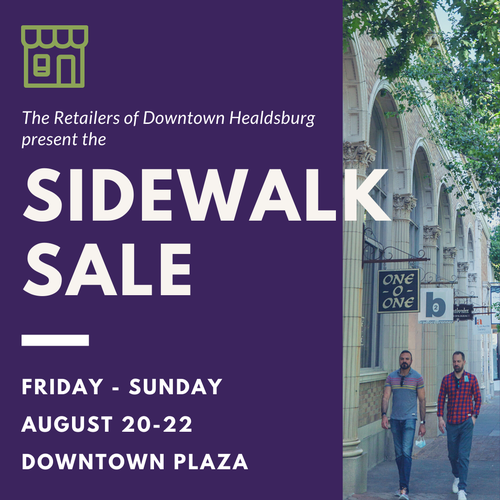 The retailers of downtown Healdsburg present the Sidewalk Sale! Join our retailers around the downtown plaza on Friday, Saturday, and Sunday, August 20-22, during normal business hours to shop 'til you drop! Please contact the individual retailer for specific sale and hours questions. For general inquiries, please email one-o-one@sonic.net.